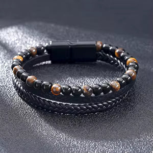 It is made from natural Tiger Eye stones, a premium braided leather band, and a stainless steel clasp. The materials are durable, hypoallergenic, and built for long term use.